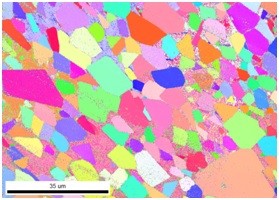 来自结晶样品的弹性背散射电子在扫描电子显微镜中产生衍射图案(菊池图案)。该图像由荧光屏检测,图案由高速 CCD 相机记录。菊池图案显示对应于聚焦电子束指向的晶格平面的布拉格反射方向的带。像往常一样,衍射图案提供了有关刚被电子束击中的晶体的类型和方向的信息。通过这种方式,我们可以获得扫描区域每个测量点的相位和方向信息,因此我们可以绘制它的方向图 (OM)。 EBSD 测量条件如下:70° 样品倾斜、20 kV 加速电压和SEM 电子束4 nA 样品电流。