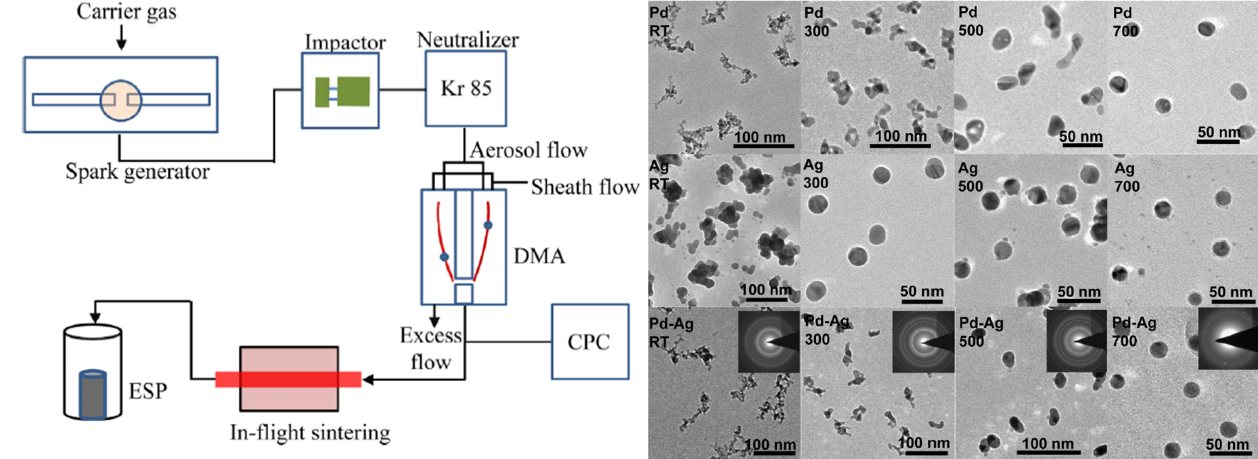 火花放电与气溶胶技术拥有超快的冷凝速度,故不同的材料可能出现非晶或结晶不充分的现象,而部分纳米粒子粒径过小也可能受限于分辨率因素。为此,VSP-G1设置了多个外接口,可与多种CVD设备进行联用。其中,通过飞行时间烧结(In-flight Sintering)可将纳米气溶胶快速加热,形成较大颗粒,并增强结晶性能。通过控制加热温度及时间,可以得到不同大小和形态的烧结纳米粒子。