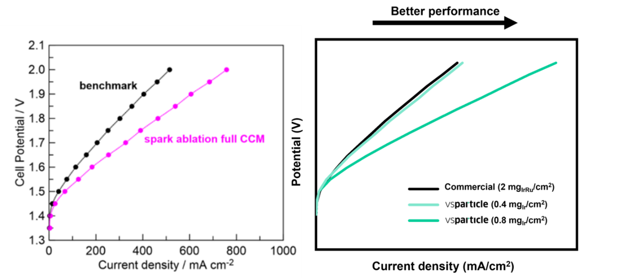 实验证明,基于火花烧蚀和气溶胶直写技术,可在Nafion膜上制造(包括但不限于Ir与Pt等金属,合金,氧化物)均匀的催化剂层。此外,与传统的制造方法相比,该技术工艺简单、可降低成本和以及碳排放。与现有技术相比,阳极Ir涂覆的CCM中贵金属负载量可减少20–80%,在4 cm2单电池中进行水电解测试优于商用CCM,,Ir的比功率密度降低了五倍(较低的值表明需要较少的Ir即可驱动电解反应)。