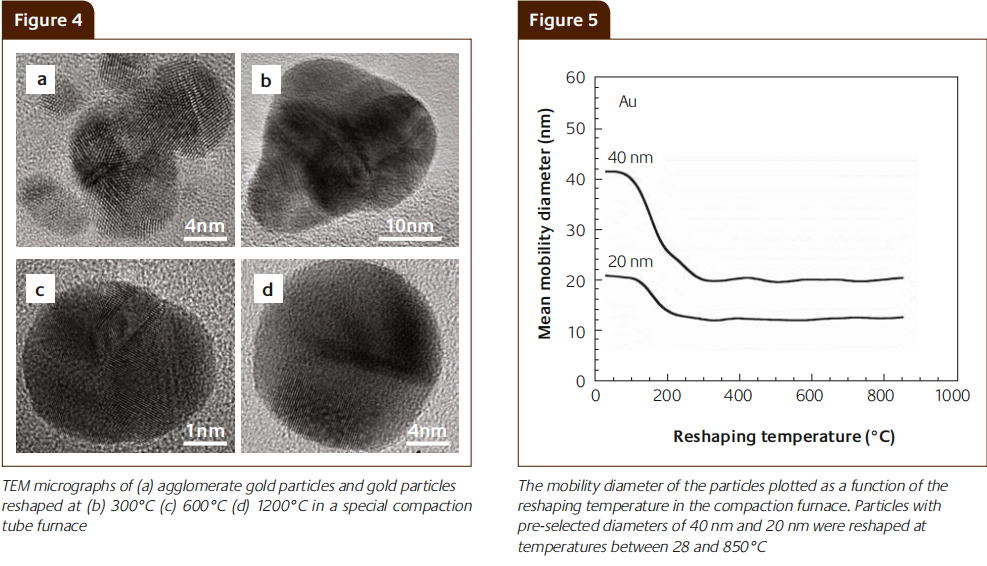 One-dimensional semiconductor nanowires are a promising candidate for future electronic devices. The epitaxial growth of nanowires is often mediated by metal seed particles, usually gold particles. In this paper the setup of a simple and robust technique to generate nanometer-sized aerosol gold particles by spark discharge is described. Furthermore we demonstrate for the first time that particles generated by spark discharge can be used to design advanced nanoelectronic structures, namely nanowires. In order to obtain compact, spherical particles suitable for nanowire growth, the sparkgenerated agglomerate particles were reshaped in a special compaction furnace. The reshaped particles were used to seed the growth of epitaxial GaP and InP nanowires, by metal organic vapor phase epitaxy, which was shown to be a reliable and reproducible method. This work indicates the possibility of using spark-discharge generated gold particles for the creation of new electronic devices even at large scale processing.