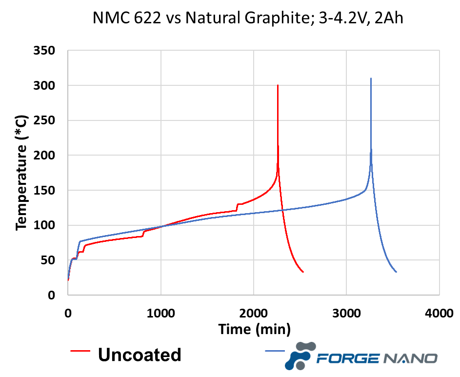 较高的充电电压往往会引起更多的副反应,削弱电极的稳定性。Forge Nano 的 ALD 工艺可以防止过度金属迁移,从而防止活性材料溶解和电池容量损失,在电池循环时保持低电阻。此外,ALD涂层还通过降低电池放电和充电过程中锂嵌入/脱嵌的能量势垒,从而提高锂离子导电性。降低电池电阻的反过来会促使电池寿拥有更高的容量保持率。