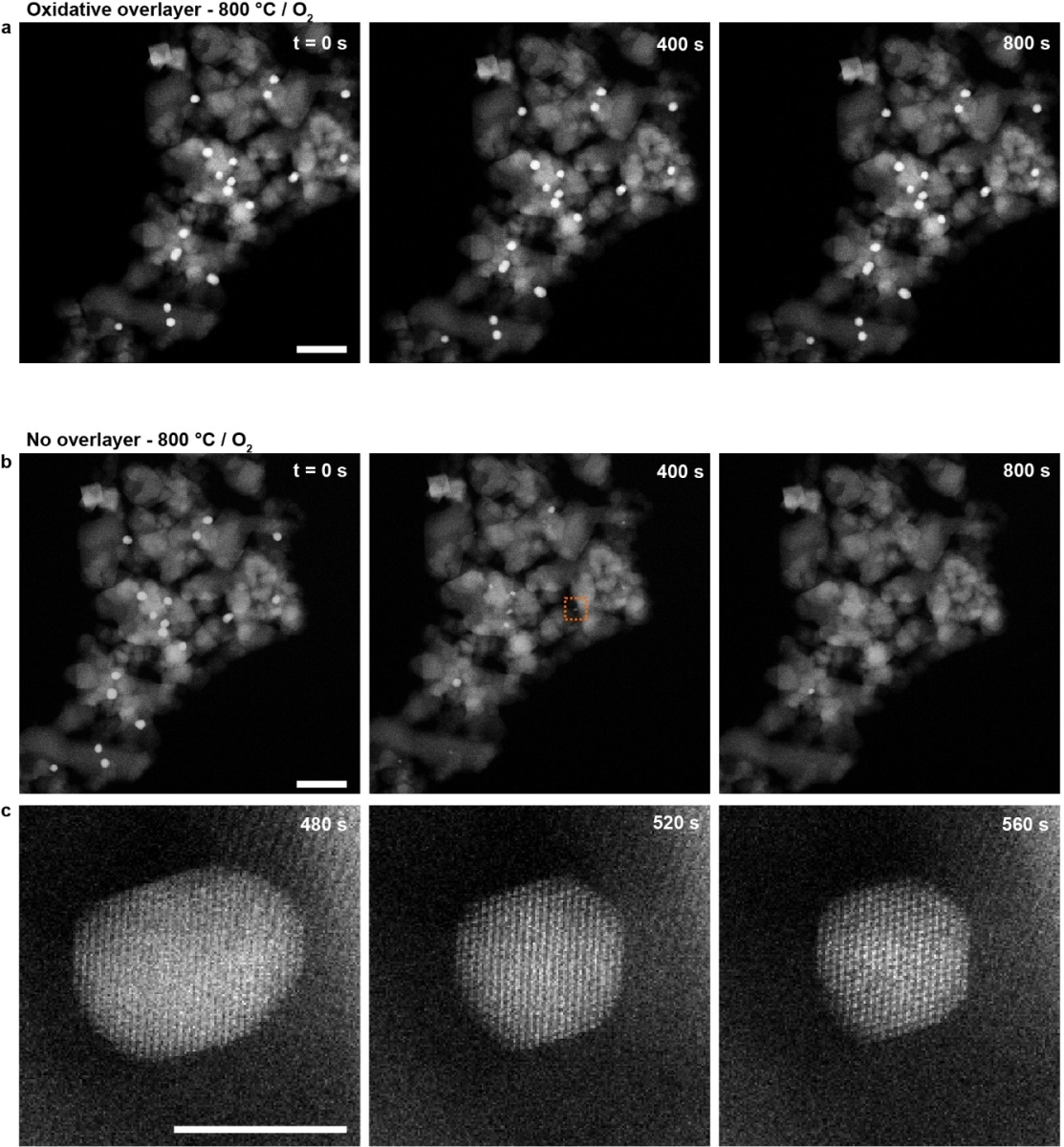 当 Pt/TiO2 样品在 20% O2/He 中加热到 800℃ 时,没有观察到纳米颗粒的尺寸发生变化。即使当催化剂样品暴露在更恶劣的环境下,在 900℃ 和 1 bar 的氧气下,也没有观察到颗粒尺寸的变化。随后在氢气处理后覆盖层去除,覆盖层去除后,撤出氢气,将样品在氧气中快速加热到 800℃,与先前的实验结果相比,没有保护层的颗粒尺寸减小,推测 Pt 颗粒可能是通过形成 PtOX 而挥发了。从上述结果中,可以发现 Pt/TiO2 样品在氧气气氛加热 900℃ 覆盖层能够保留,并且覆盖层能够避免 Pt 在氧气气氛中挥发。