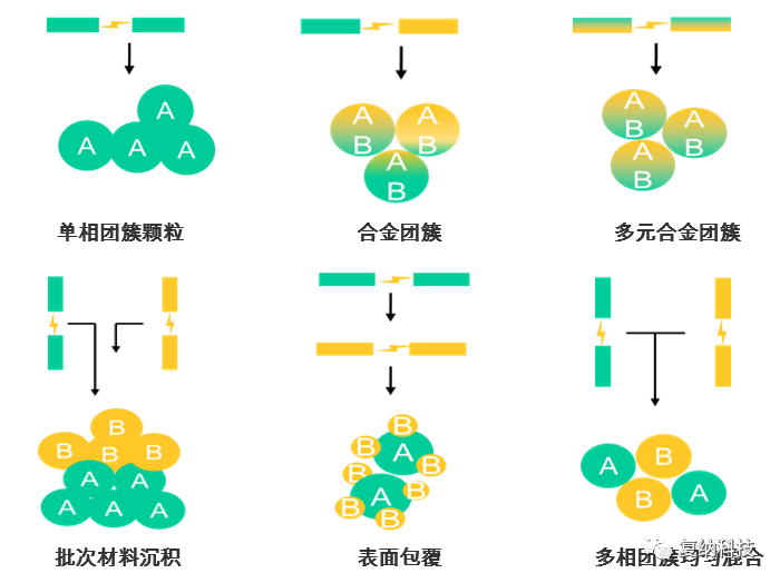 火花烧蚀技术最大的特点便是其混合材料的能力。与其它放电技术相比,火花放电中阳极靶材也会产生颗粒,从而实现极高温度(20000K)下的物质混合。通过这一方法,可以制备许多常规方法无法合成或宏观条件下不互溶的物质,如二元合金或者多元合金。利用火花烧蚀的方法更可以合成化学法难以实现的纳米高熵合金合成,并实现粒径以及成分的调控。