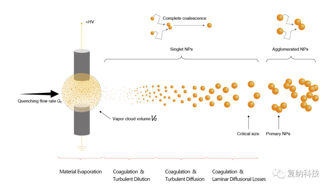 在所有影响因素中,气体分子的作用对于控制颗粒的粒径至关重要。而在真空气相沉积技术中,往往很难通过气体分子影响颗粒的粒径,这一方面是因为气体分子较少,另一方面是颗粒的运动距离较短。而火花烧蚀的方法在常压条件下的流动惰性气体中进行,颗粒从原子凝并成为团簇,最终长大成为纳米颗粒。气体分子可以吸收纳米粒子的能量使其迅速冷却,同时也促进颗粒之间的碰撞与凝并。