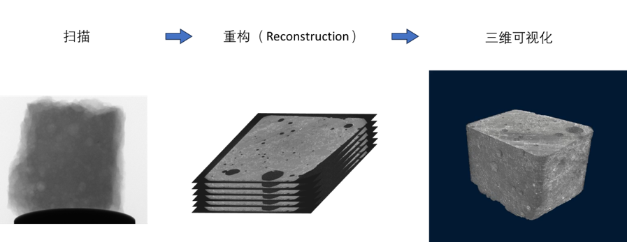 重建:通过收集到的投影数据, 通过使用计算机重建算法进行图像重建。 较常用的算法是滤波反投 影算法 (Filtered Back Projection) , 它通过对投影数据进行滤波和逆投影操作, 重建出样品的三维图像。