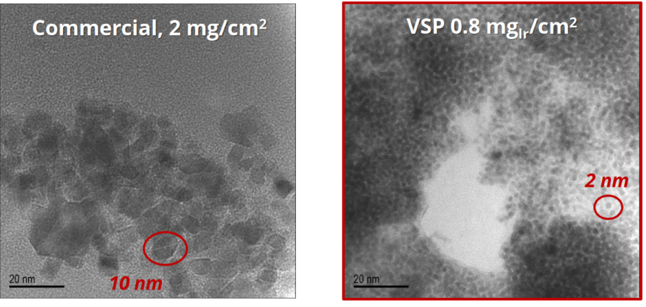 商业 Ir 催化剂尺寸较大,而纳米气溶胶沉积可制备出更小的团簇 Ir 颗粒