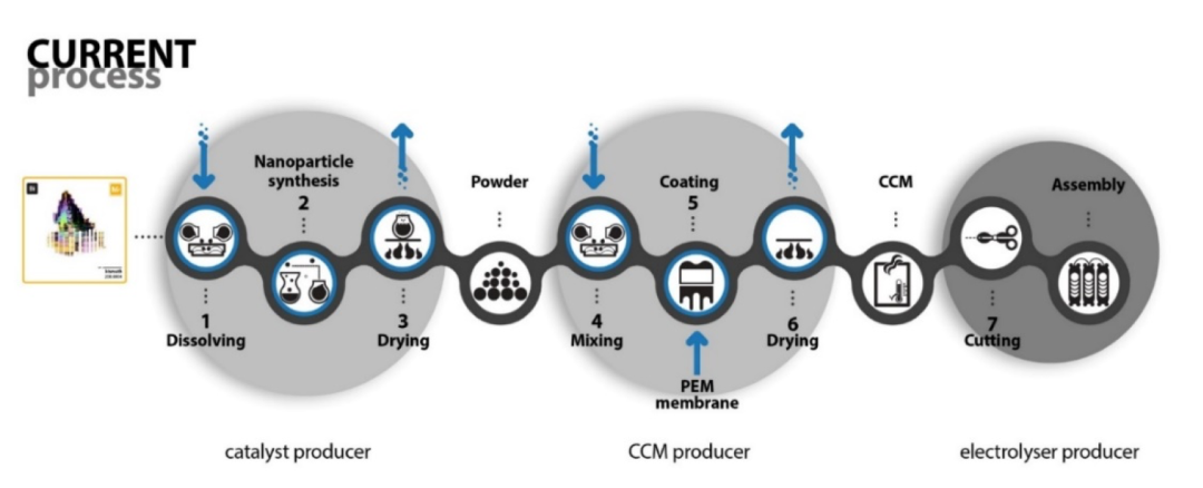 研究中,大家普遍比较关注材料最终的性能以及其对应的制备方法,但却容易忽略具体使用场景。比如电解水制氢和燃料电池,纳米催化剂(铂族)需要沉积在膜材料表面制成膜电极(CCM)。这一过程异常繁琐,一般会分为几个主要步骤:
