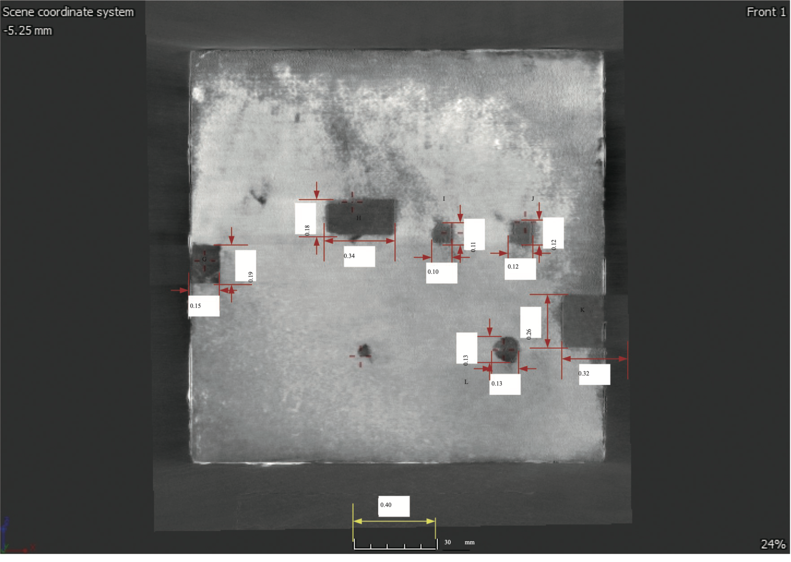 图 9 :孔洞缺陷切片图,由缺陷切片图结果分析得到,基于显微 CT 系统条件,可以清晰获取陶瓷基复合材料缺陷 的位置、大小、类型等信息。