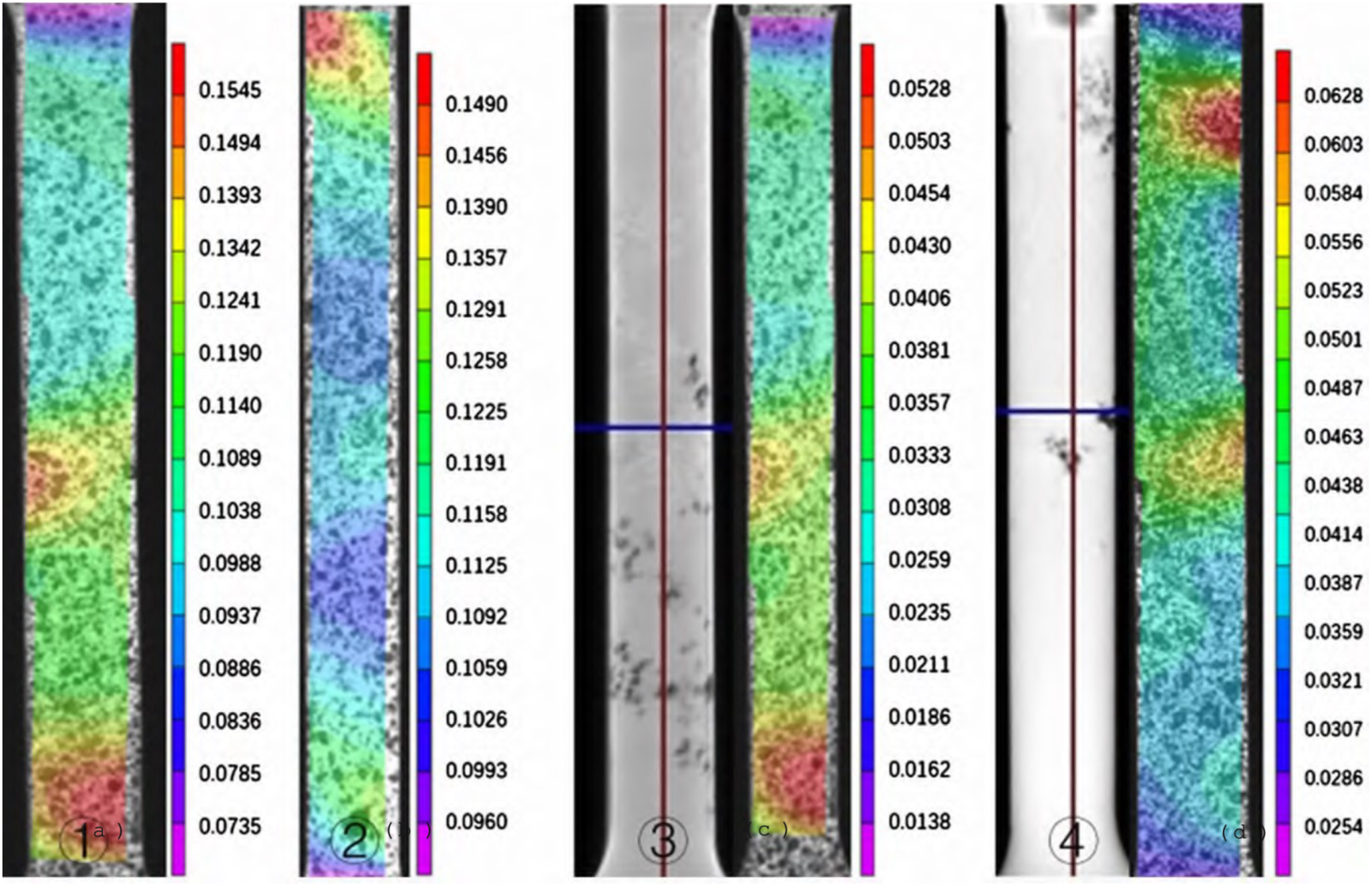 图 5 :铸造缺陷对应变分布的影响。图中③、④左侧均为试样分层 CT 照片,右侧为 DIC 测出的轴向应变分布图。两者对比分析可知,轴向应变高度集中于缺陷区域。缩松严重影响球墨铸铁的力学性能, 降低其弹性模量、强度极限,尤其是使材料伸长率下降,极易在缺陷处发生失效及断裂。