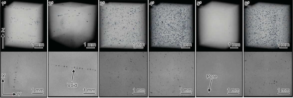 图 6 :上图 为 SLM 成 形 GH3536 试样的重建数据分析结果,其中第一行数据为不同成形工艺试样中缺陷(被渲染成蓝色)的三维分布,第二行数据为试样中垂直 Z 向的典型 CT 切片。由图可知,不同参数组合成形的试样中都含有缺陷,且彼此之间缺陷数量差异较大, 这表明通过控制工艺参数可以获得不同致密度的试样。