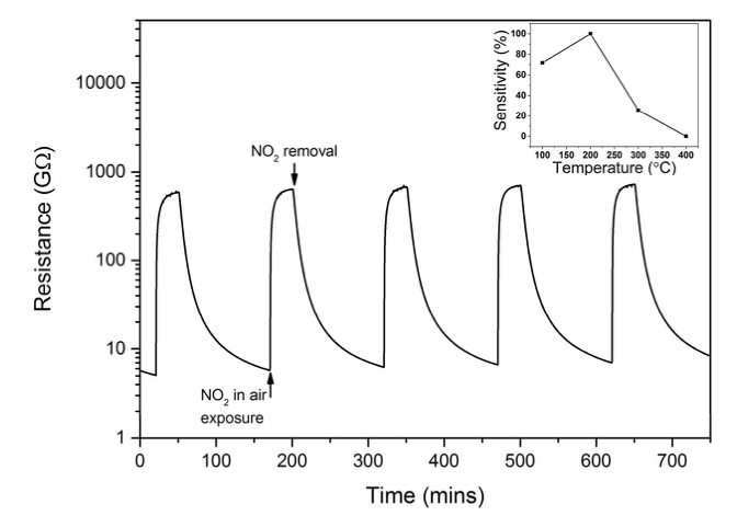 下图显示了 2.5µm 厚的 WOx 薄膜在 200°C 的纯空气以及含有 NO2 的空气中电阻的循环测量结果。每个循环暴露在纯空气中 2 小时,然后暴露在含有 1ppm NO2 的空气中 30 分钟。正如预期的那样,当在周围空气中引入 NO2 分子时,膜的电阻增加,传感器的响应不会随着循环而显著变化,这表明薄膜在循环过程中不会改变其性质。并且当从周围空气中去除 NO2 时,在暴露过程中化学吸附在薄膜表面上的大多数 NO2 分子会解吸。