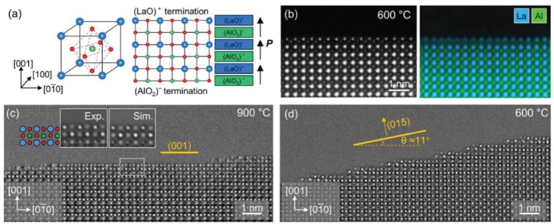 极性表面存在未补偿的表面电荷,反应活性高,本质上并不稳定。伴随着各种表面重构的电荷补偿现象,为它拓展了新的应用领域。原子级原位TEM研究表明,原子台阶和台阶辅助重构在极性氧化物表面的电荷补偿中发挥着关键作用。平坦的(LaO)+——断头 LaAlO3(001)极性表面在真空中高温退火时,通过原子台阶的运动和相互作用过渡到(015)邻面。虽然(015)邻面沿表面法线方向具有零极化,但当面内极化通过台阶边缘原子的重构得到完全补偿时,就实现了热力学基态,稳定下来;台阶边缘的 La 原子从其普通原子位点移向相邻的Al台阶边缘位点,导致在相应的台阶边缘处形成带负电的 La 空位。第一性原理计算证实,所观察到的(015)邻面的台阶重构可以完全消除面外和面内电场。这种新发现的机制揭示了台阶重构在稳定极性表面中的核心作用,为理解伴随台阶重构的新型电荷补偿机制提供了宝贵的见解。