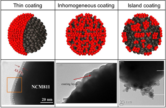 Jung 等人在早期报告中将钴酸锂(LiCoO2)的 UC 阴极与 PC 和 DC Al2O3 包覆的 LiCoO2 阴极进行了比较。在报告中,PC 比 DC 表现出更好的容量保持率。之后,Jung 等人报道了使用 DC 方法改性的 LiCoO2 和天然石墨(NG)电极比 PC 电极具有更好的循环性能。同样,在一些报告中认为 PC 电极具有更好的性能,特别是在高温环境下;也有一些报告则认为 DC 策略更好。