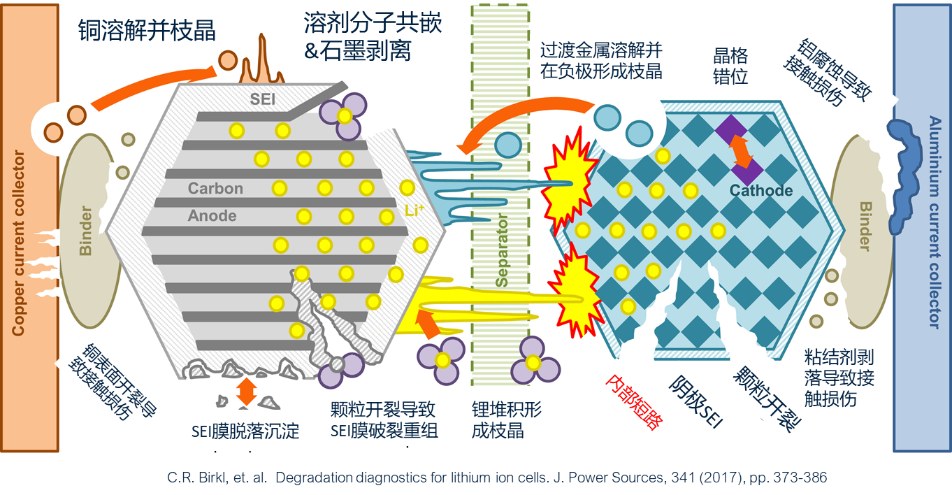 无论是由于 SEI 自身的不稳定性质还是电极的体积波动,都可能导致电解质和电极表面之间的不间断接触,进而引发的副反应会消耗电解质,并使电极退化,最终导致电池失效。