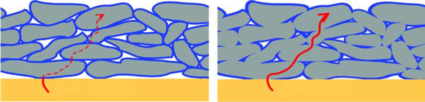 左:颗粒包覆电极 右:平面涂层电极
