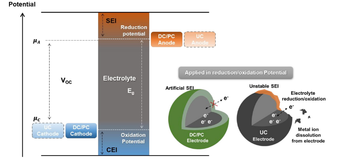 为了便于识别通过这两种涂层改性策略获得的电极,我们将平面涂覆电极称为“DC”电极,将粉末涂覆电极称为“PC”电极。而原始的未涂层电极被称为“UC”电极。下图展示了电极和电解质中电子的相对能量以及 UC 电极可以达到热力学稳定的氧化和还原电位区域。这是因为在还原电位 μA 以上,负极会还原电解质,而在氧化电位 μC 以下,正极则会氧化电解质。如果添加钝化层(例如在 DC 和 PC 电极的情况下)阻碍 SEI 的电子转移,则可以防止这种不稳定的氧化还原反应,从而维持电极的稳定。