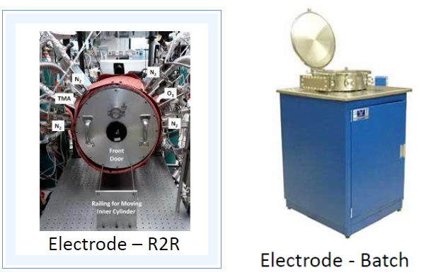 电极极片的卷对卷设备(左)以及传统的批次片对片式 ALD 设备(右)