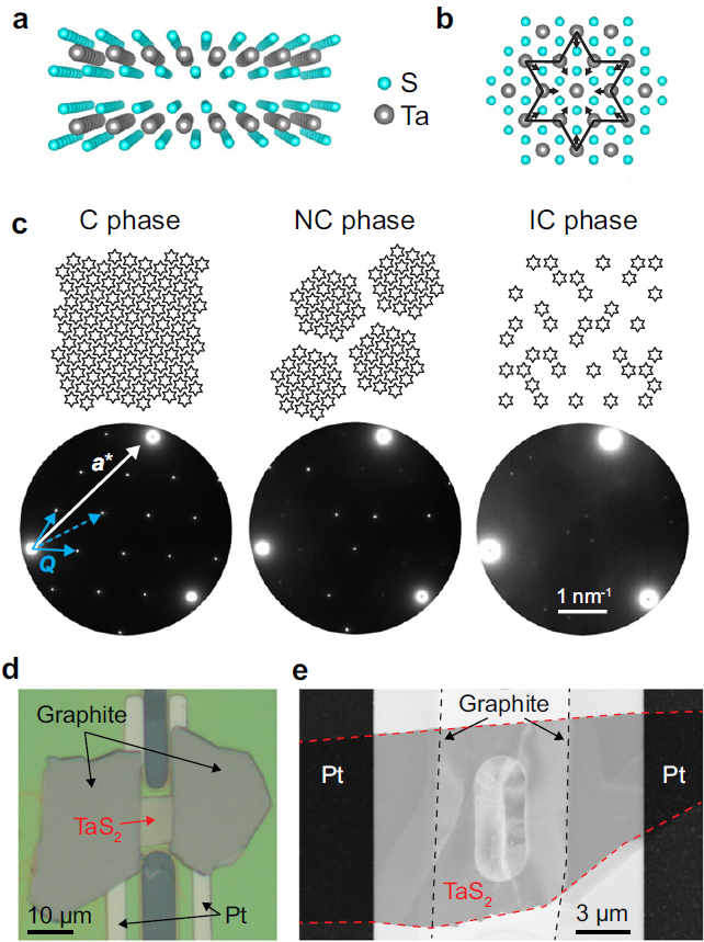 图 1. 1 T-硫化钽的切面图(a)和平面图(b)。图 a 中展示了局域电荷密度波的畸变,呈大卫六芒星结构。图 c 展示了对称(C相)、准对称(NC 相)、非对称(IC 相)三种电荷密度波相,分别具有不同的星形排列方式,对应的电子衍射花样如图所示。对于对称相的衍射花样,标出了布拉格矢量 a、一阶电荷密度波 Q 矢量(实线)、二阶电荷密度波矢量(虚线)。所研究的硫化钽器件的光镜照片和 STEM-HAADF 照片分别如图 d 和图 e 所示。在 STEM 照片的中心是通孔的 SiNx 支撑膜,便于电子衍射花样的测量。