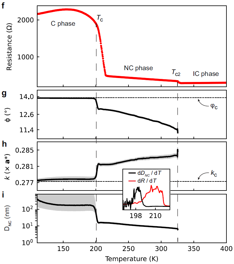 图2. f 为硫化钽电阻的温度依赖性。图 g-i 分别为电荷密度波角度 φ,电荷密度波波矢振幅 k,畴区尺寸 DNC。阴影区代表了标准差。小插图中横轴为温度(K),展示了畴区尺寸、电阻对温度的微分。