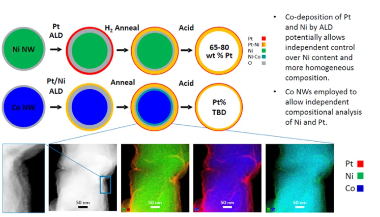 在另一项同样来自美国国家可再生能源实验室的研究中,使用高通量的 ALD 技术构筑 Pt 催化剂涂层,可实现 Ni / Co 纳米线材料的高效催化,并防止金属元素浸出损耗 [2]。
