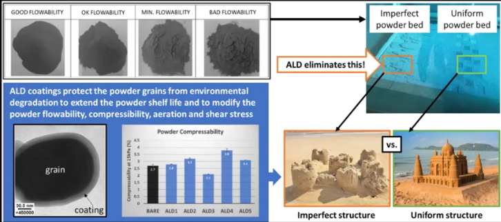 粉末冶金利用粉末材料铸造型材,这对粉末材料的流动性和分散性有较高的要求。在粉末熔融的过程中,团聚颗粒以及天然氧化层中的杂质对于最终型材的质量会有较大影响。通过 ALD 技术进行粉末包覆后,材料的抗侵蚀,耐潮性,流动性有明显改善,同时涂层成分的变化还可以赋予粉末功能,如改变其反射率,亲水性等,扩大应用场景 [3]。