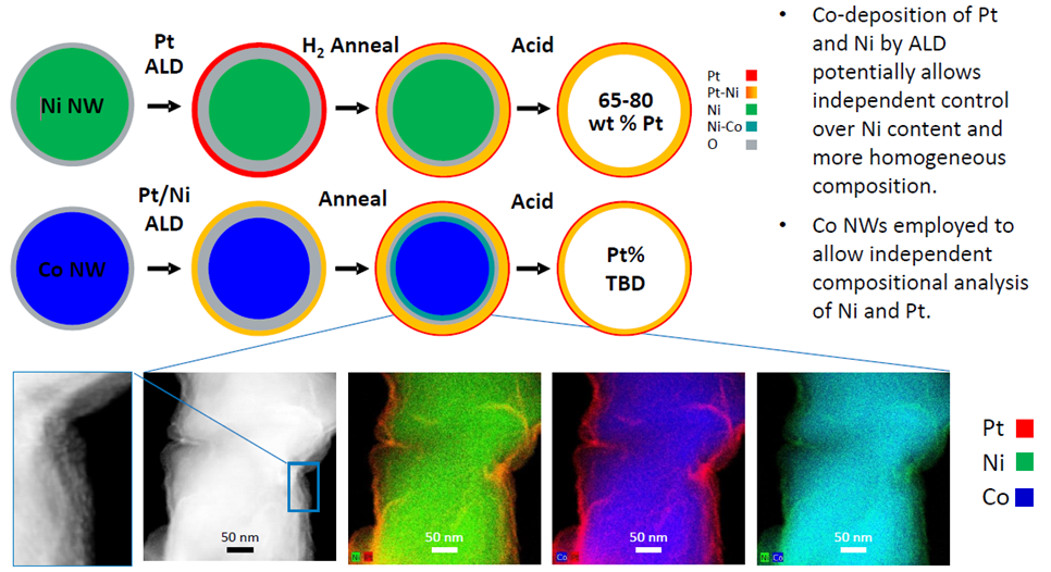 在另一项同样来自美国国家可再生能源实验室的研究中,使用高通量的 ALD 技术构筑 Pt 催化剂涂层,可实现 Ni/Co 纳米线材料的高效催化,并防止金属元素浸出损耗[2]。