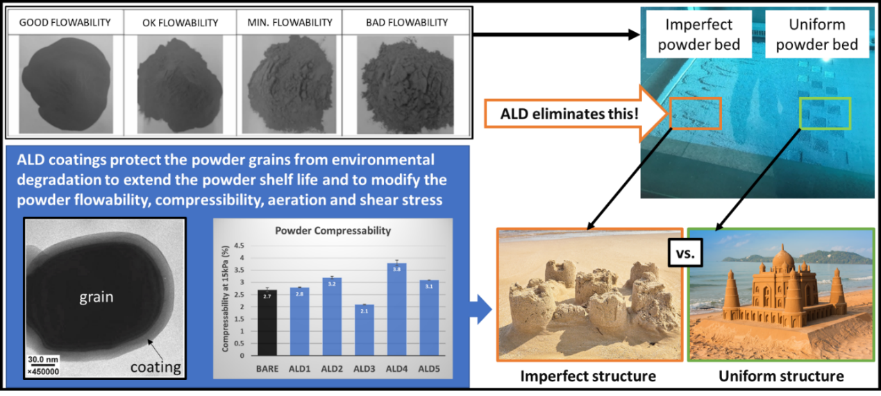 粉末冶金利用粉末材料铸造型材,这对粉末材料的流动性和分散性有较高的要求。在粉末熔融的过程中,团聚颗粒以及天然氧化层中的杂质对于最终型材的质量会有较大影响。通过 ALD 技术进行粉末包覆后,材料的抗侵蚀,耐潮性,流动性有明显改善,同时涂层成分的变化还可以赋予粉末功能,如改变其反射率,亲水性等,扩大应用场景[3]。(详见:原子层沉积在增材制造——3D 金属打印中的应用)