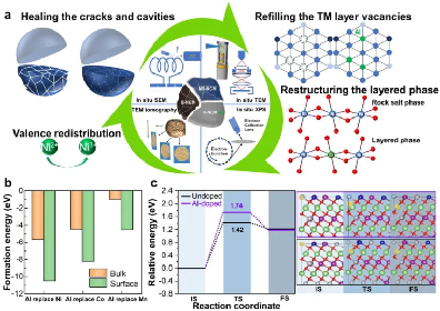 图 2. a. 多尺度观察 NCM523 材料直接再生机制的示意图;b. NCM523 结构块体、表面铝离子分别替换镍离子、钴离子、锰离子的形成能对比;c. 铝掺杂和未掺杂的 NCM523 的镍从 TM 层到锂层的扩散势垒。