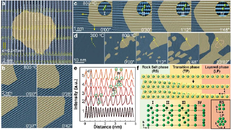 图 5. a. 原位 HRTEM 图像记录了从室温到 600 ℃ 时铝包覆层迁移到 NCM523 颗粒裂缝的过程;b. 原位 HRTEM 图像反映了 800 ℃ 时 NCM523 晶粒中补充铝的扩散过程;c. 原位 HRTEM 图像展示了 NCM523 颗粒的表面空位的热愈合过程。