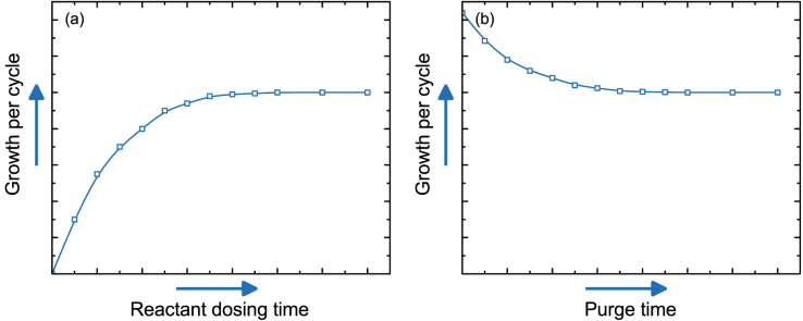 图 3.每个循环的理想生长 (GPC) 作为 (a) 反应物(前驱体或共反应物)加料时间和 (b) 吹扫时间的函数,说明了自限性 ALD 行为。达到饱和后,添加额外的前驱体或延长吹扫时间不会导致 GPC 发生变化。请注意,必须测量前驱体(或共反应物)投料时间为 0 秒时的数据点。当吹扫时间太短时,可能会发生寄生 CVD,从而导致 GPC 升高。