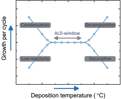 图 4.每周期生长量(GPC)与沉积温度的函数关系,显示了理想化的 ALD 窗口。此外,图中还显示了在高温或低温条件下可能出现的与前驱体相关的现象。