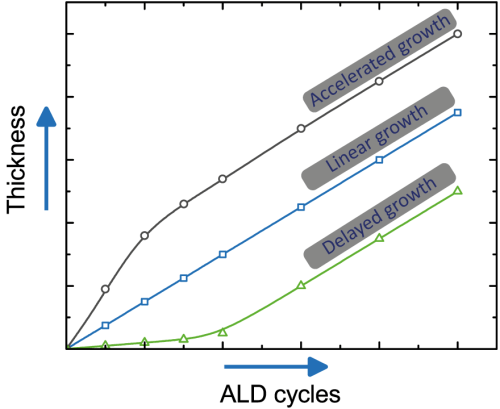 图 6.厚度与 ALD 循环次数的关系示例,说明了初始 ALD 循环期间加速、线性和延迟生长之间的差异。