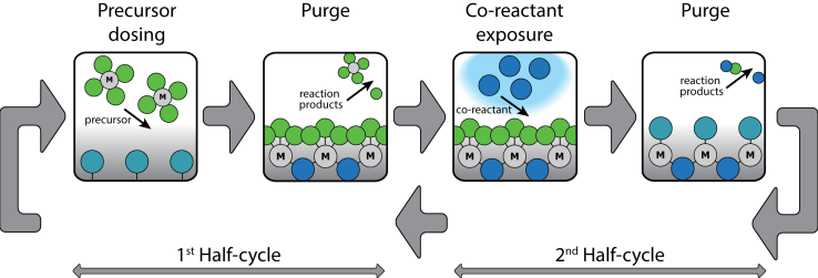 图 1.由两个半周期组成的典型 ALD 循环示意图。连续的前驱体和共反应剂剂量通过气体吹扫或泵(抽真空)操作步骤分隔,导致自限性薄膜生长。“M”表示金属原子,例如可以与氧原子或氮原子(蓝色)结合,分别形成金属氧化物或金属氮化物。前驱体配体呈绿色,通过与共反应物反应而消除,最后被清除。