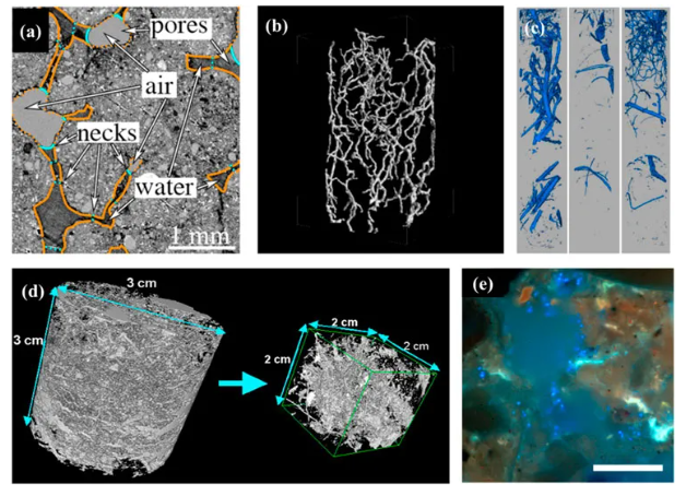 (A)非饱和多孔土壤团聚体的 X 射线计算机断层扫描(X 射线 CT)切面、饱和孔隙和非饱和孔隙以及颈部区域;(B)带根土壤的显微计算机断层扫描重建切面;(C)土壤核心中根网络的三维可视化;(D)利用同步加速器 X 射线 CT 表征土壤团聚体;(E)在体积密度为 1.3 g cm-3 的土壤微生态系统薄切片中 DAPI 染色的荧光假单胞菌细胞(亮蓝色)。图片源于文献【3】。