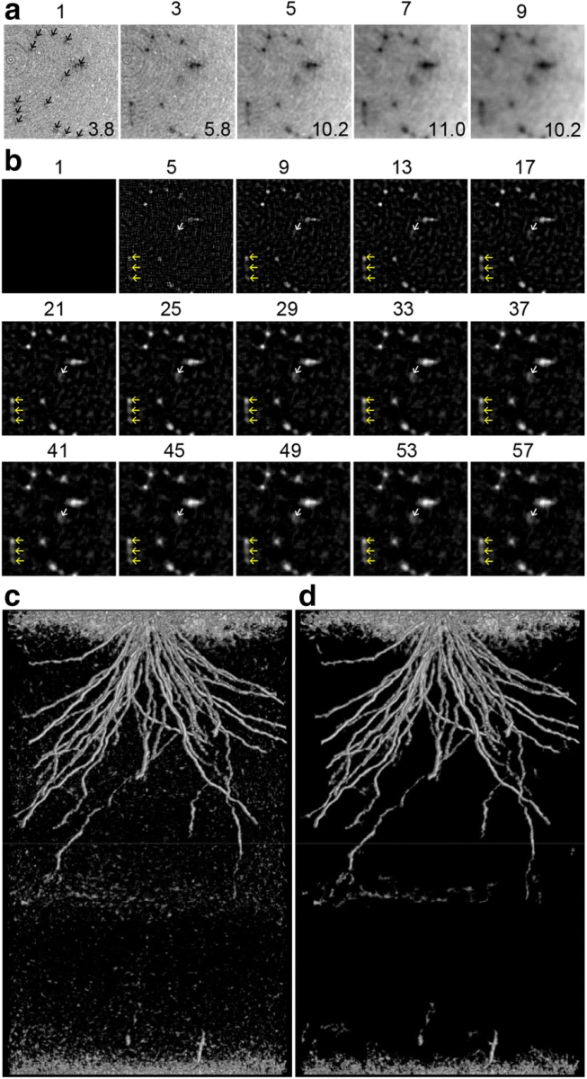 利用显微CT 技术实现水稻根系结构的高通量三维可视化:(a) X 射线 CT 容积按比例放大的水平切片,使用核大小为 1、3、5、7 和 9 的三维中值滤波器进行过滤,图像上方的数字表示核大小,图像上的数字表示对比度与噪声比。最左侧图像中的箭头表示具有代表性的根碎片;(b) 模糊滤波器核大小对边缘检测的影响。图像上方的数字表示内核大小,箭头表示有代表性的树根片段,使用内核大小 5 时,白色箭头表示的树根几乎不可见,而使用大内核大小(如 57)时,黄色箭头表示的树根会粘连在一起;(c )图像处理后 CT 容积的水平投影,未进行阈值处理或尺寸开放;(d )图像处理后 CT 容积的水平投影,进行了阈值处理和尺寸开放。图片源于文献【1】。
