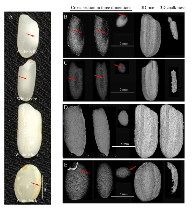 使用显微CT 研究稻米垩白的形状和位置(a)。白腹(X220)、白核(X226)、白全(香早仙)和白背(X191)垩白精米;分别具有白腹(b)、白核(c)、白全(d)和白背(e)垩白的精米的横截面图像、重建的3D稻米图像和重建的3D垩白图像。红色箭头所示的深色区域代表稻米垩白的位置。图片源于文献【4】。