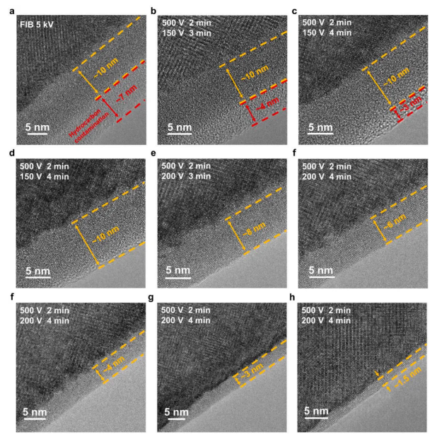 上图为去除 FIB 产生的表面非晶层的完整流程。(a) 30 kV FIB 切割样品的HRTEM 照片。(b-d) 连续使用低能氩离子精修后的 HRTEM 结果。图片中标识了对应的精修参数和非晶层厚度。