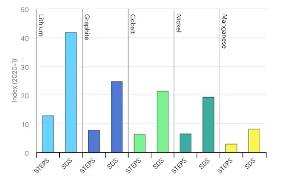 图 1. 与 2020 年相比,2040 年清洁能源技术对特定电池相关矿物的需求增长。STEPS 和 SDS 代表与气候政策相关的两种不同情景,用于估算需求,其中 STEPS 是国际能源机构提出的最有可能的情景。指数单位是任意的,以显示增长。