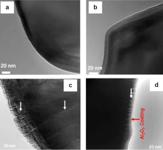 图 2.电化学循环前未包覆的 NCA (a) 和 Al2O3 包覆的 NCA (b) 的 TEM 图像,以及在 3-4.8 V 电压下(1C/1C 充放电率)循环 100 次后分别从电池中提取的相同正极(c,d)的 TEM 图像。