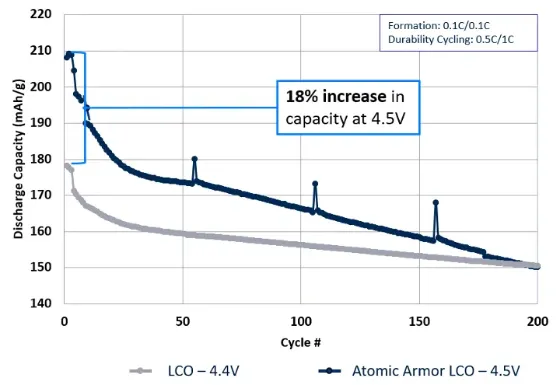 图 4 则进一步提高了这一性能。图 4 显示了未进行涂层包覆的电池在 4.4V 电压下循环时的放电容量,以及使用 Forge Nano ALD 技术进行电极涂层包覆的电池在 4.5V 电压下循环时的放电容量。更高的电压运行与受保护的电极相结合,电池的初始放电容量提高了 18%。此外,更高的工作电压不会影响电池的使用寿命,这意味着使用原子盔甲技术,可以从电池中获得更多能量,而不会牺牲电池的使用寿命。
