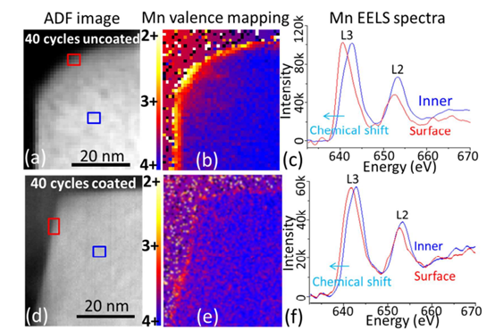 Yan 等人【9】探索了 Al2O3 涂层在连续流 ALD 反应器沉积同一正极材料上的作用机制。利用先进的TEM和电子能量损失谱(STEM-EELS)对 PC 和 UC 正极上的 SEI 进行化学可视化,获得两种样品在 40 次循环后的 Mn 价态分布。
