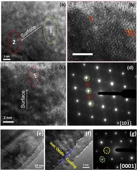 高分辨率透射电子显微镜图像显示:(a–c) UC NMC颗粒,(e,f) PC Al2O3 包覆的 NMC 颗粒,这些颗粒分别来自经过530、760 和 290 次充放电循环的 2Ah软包电池;以及来自 (d) 未涂层的 NMC,(g) Al2O3涂层的 NMC 的选区衍射(SAED)模式图