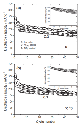 对于 LiMn2O4 基电池,氧化铝包覆有助于减少 Mn 的溶解,同时提高电池在高温下的性能。
