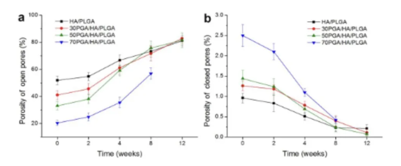 使用显微CT计算高分子材料在 0-12 周降解过程中开放(a)和闭合(b)孔隙率的改变。图片源于文献【1】