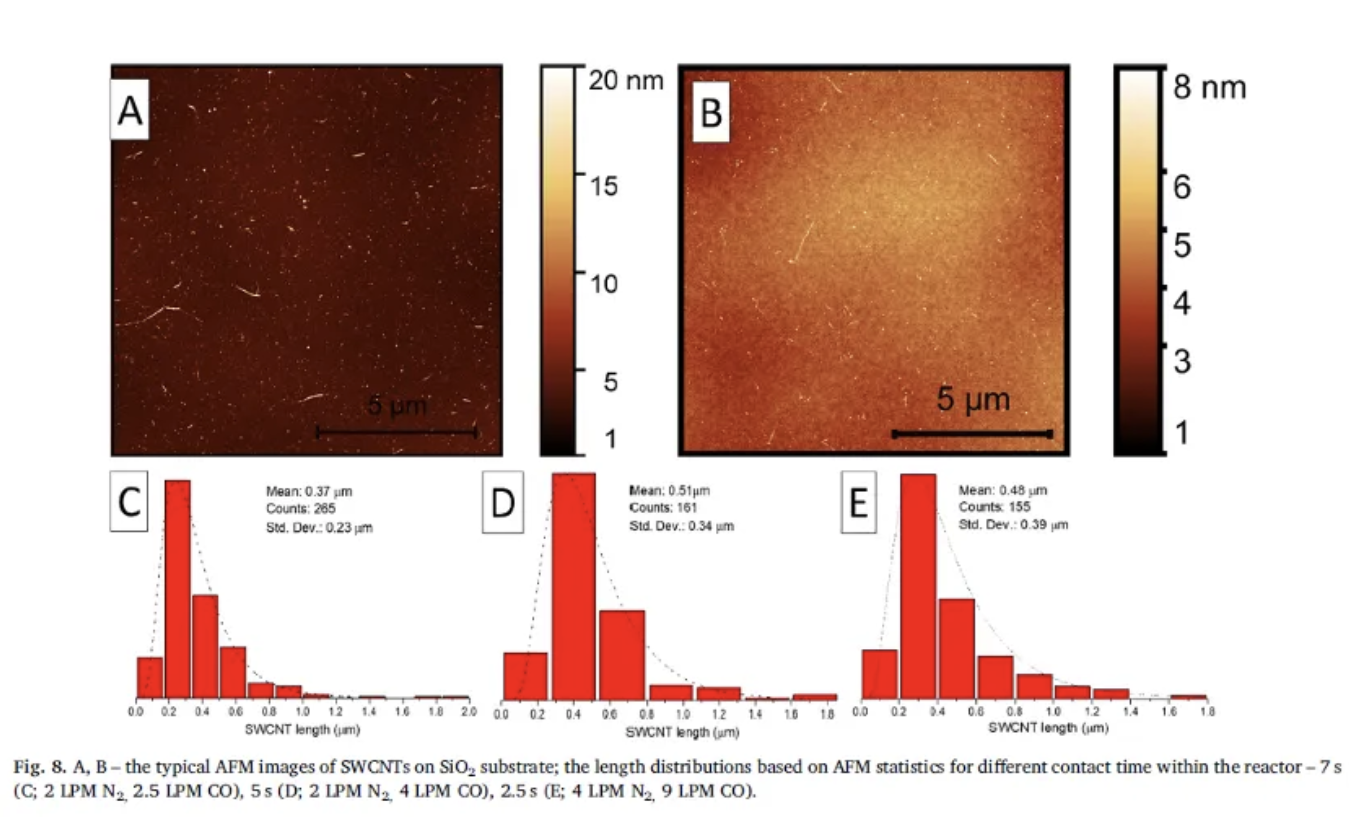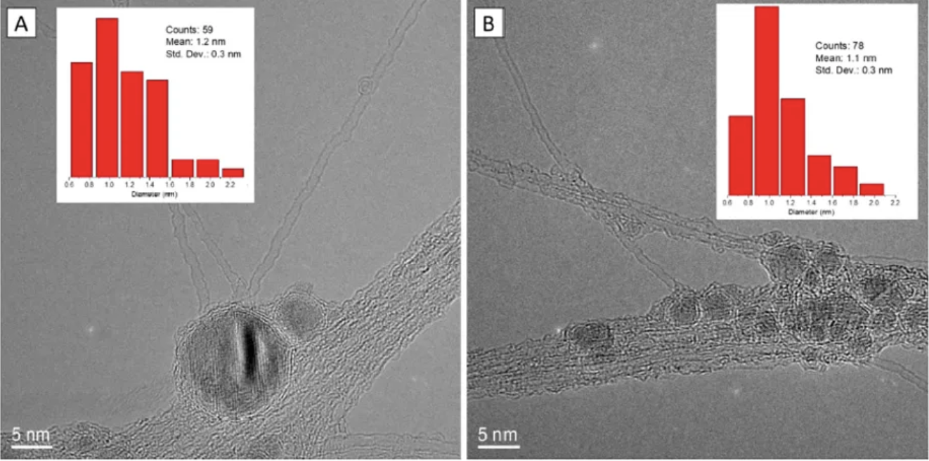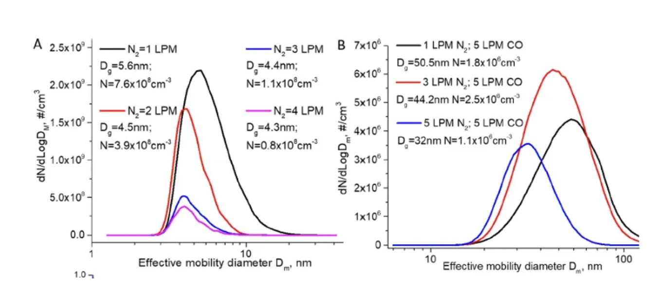 3不同的火花放电气流参数产生不同粒径的 Fe 催化剂颗粒(A)以及产生的碳纳米管(B)