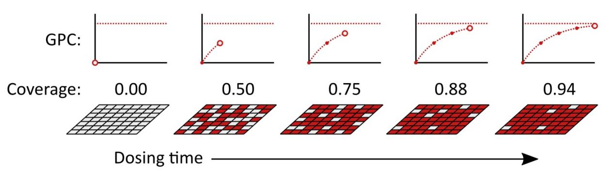 图1:表面覆盖率θ:在一个 ALD 半周期内,表面覆盖率和 GPC 与给药时间的关系。