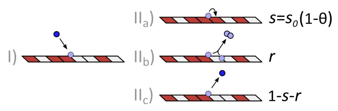 图 2:(等离子) ALD 过程中气相反应物(蓝色圆圈)与表面之间的模拟相互作用图,其中方块代表空的(白色)和已占用的(红色)吸附位点。当反应物分子或原子撞击表面 (I) 时,它可以吸附在空的吸附位点 (IIa ),与表面上的另一个原子重新结合 (IIb ) 或反射 (IIc )。只有吸附 (IIa ) 才能增加表面覆盖率。