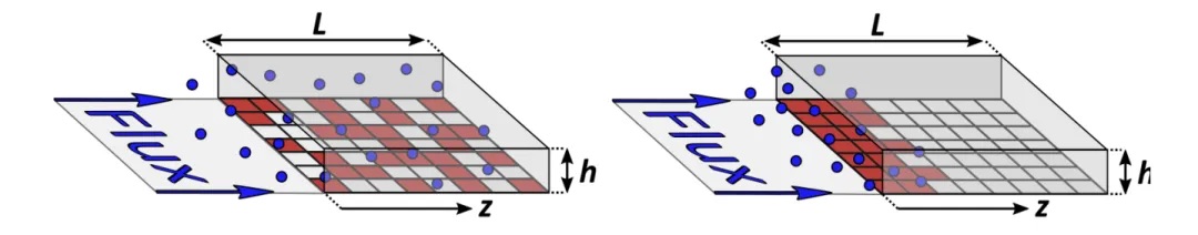初始粘附概率 S0 和复合概率r是决定生长机制和最终薄膜保形性的重要参数。下面将讨论这些不同的生长机制,其中模拟结果假设为“单粒子”,自由分子在狭窄的沟槽中扩散(即间隙高度h≤沟槽宽度,见图3)。虽然实际情况通常更为复杂,考虑到气相碰撞、复杂的 3D 几何形状等,但总体行为本质上是通用的,通常在低压力下(例如,对于微米级孔或沟槽的压力<1托)是现实的。