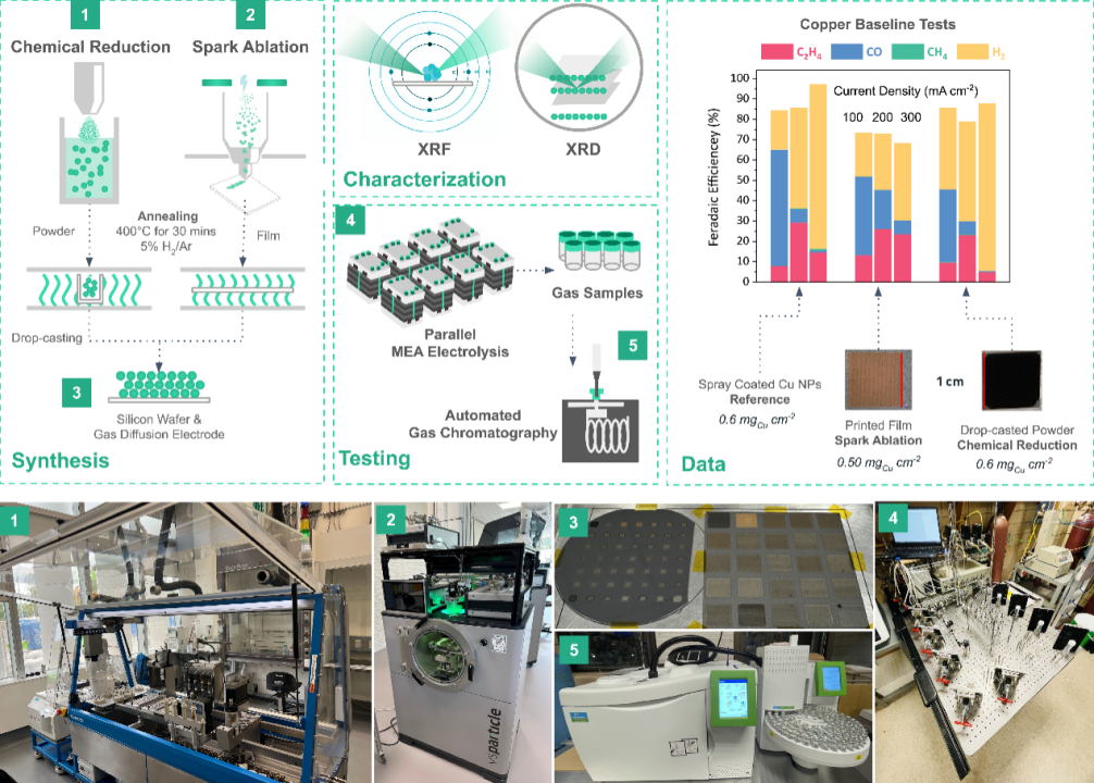 为了弥补这一差距并加速材料的发现之路,VSP、Meta 和 UOT 携手在实验室中测试数百种独特且多样化材料的数据集—创建开源催化数据库。VSP-P1 纳米打印沉积系统使用一种称为火花烧蚀的气相沉积工艺,通过将每种材料汽化成纳米颗粒,得到了传统方法较难合成的525 种催化剂,人工智能模型预测这些材料是二氧化碳还原反应 (CO2RR) 的最佳候选材料。