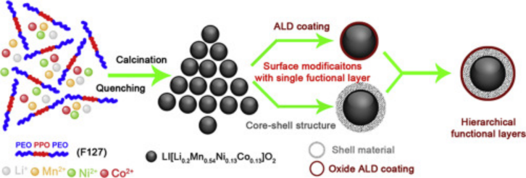 进一步研究中,Zhao等人[3]报道了分层功能层对富锂层状 Li1.2Mn0.54Ni0.13Co0.13O₂(NMC)纳米颗粒的协同效应。通过结合不同锂化学计量材料(如LiCoO₂、LMO 和 LiCoMnO₄)作为初始壳层,并以ALD氧化物(ZrO₂、Al₂O₃ 和 TiO₂)作为最终涂层,设计出高性能 LIB 阴极。